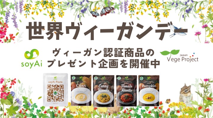 【プレゼント企画】11月1日は世界ヴィーガンデー。ヴィーガン認証のソイ商品soyAiがもらえるチャンス! 【プレゼント企画】11月1日は世界ヴィーガンデー。ヴィーガン認証のソイ商品soyAiがもらえるチャンス!2023-11-01T16:36:22+09:002023/11/01|