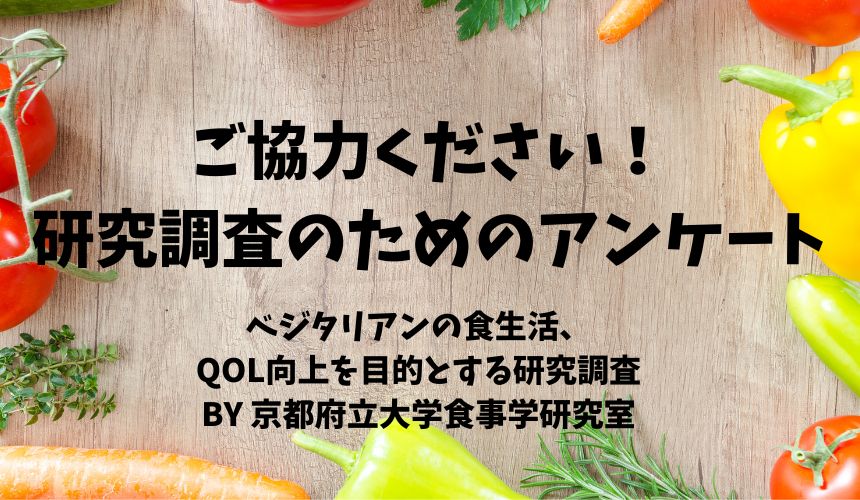 京都府立大学食事学研究室では、ベジタリアンの食生活と心理的側面の関連を研究しています。現在、菜食を実践される方の生活などに関するアンケートと食事調査アンケートを実施しています。ご協力頂いた方にはご自身の栄養状態を評価した栄養結果評価表をお送りします!ご自身の食生活の振り返りにご活用ください!回答期限は9/23まで