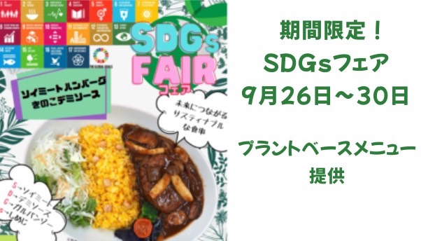 9月26日~30日まで、JICA・都内区役所などの食堂で秋の「SDGsフェア」が開催され、期間限定でプラントベースメニューの「ソイミートハンバーグ きのこデミソース」が提供されます。この機会に未来につながるサステナブルな食事を召し上がってみませんか。食堂は一般の方でも利用可能ですので、ぜひ足を運んでみてください!