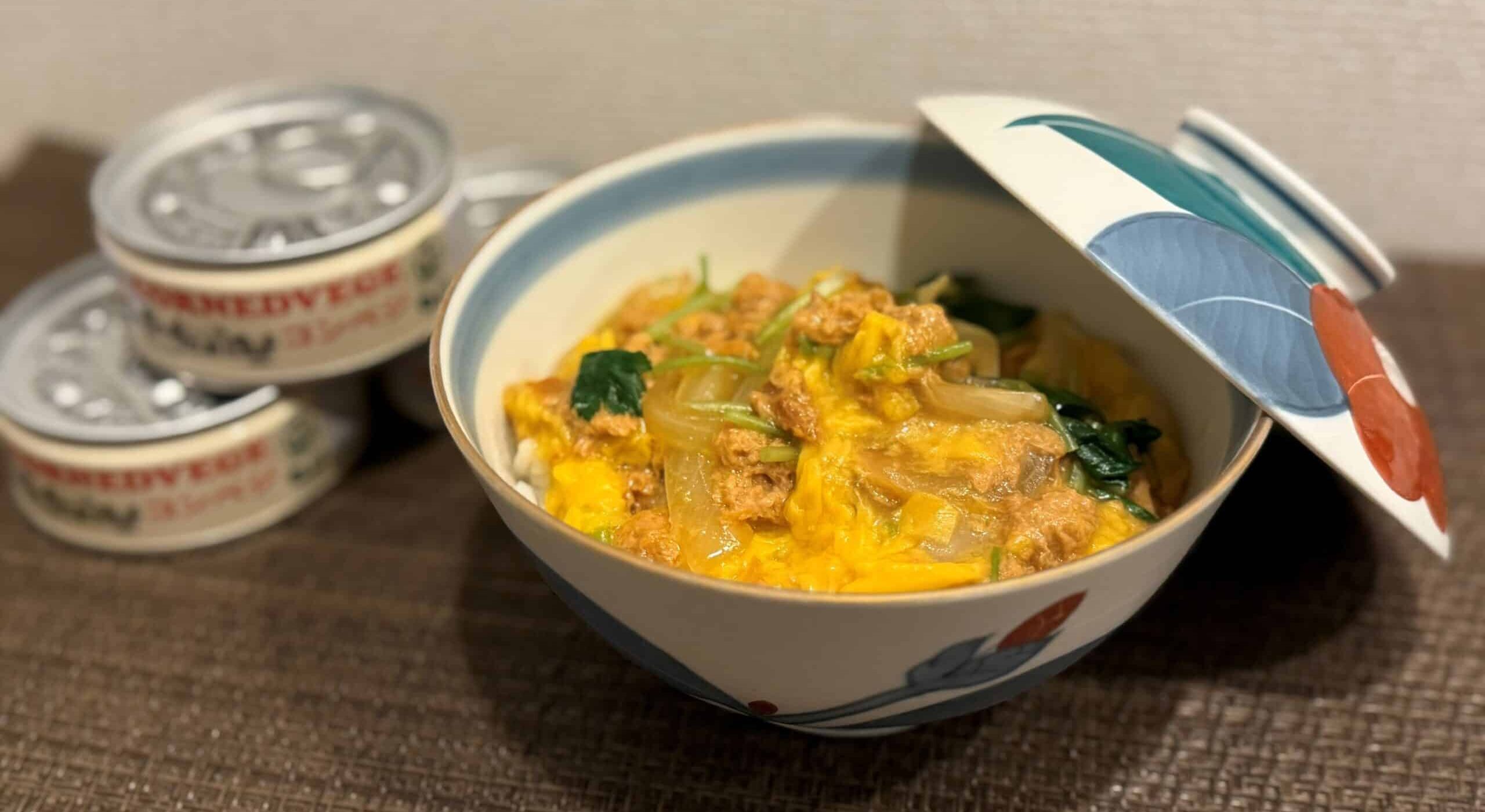 本製品とベジプロのヴィーガン認証製品「畑から生まれたたまご」を組み合わせた一品です。コンベジを使用することで一般的な大豆ミートのみでは出しにくいコクをプラスできます。和風のだしの香りとコンベジの旨味が調和した、本格的な味わいです。
