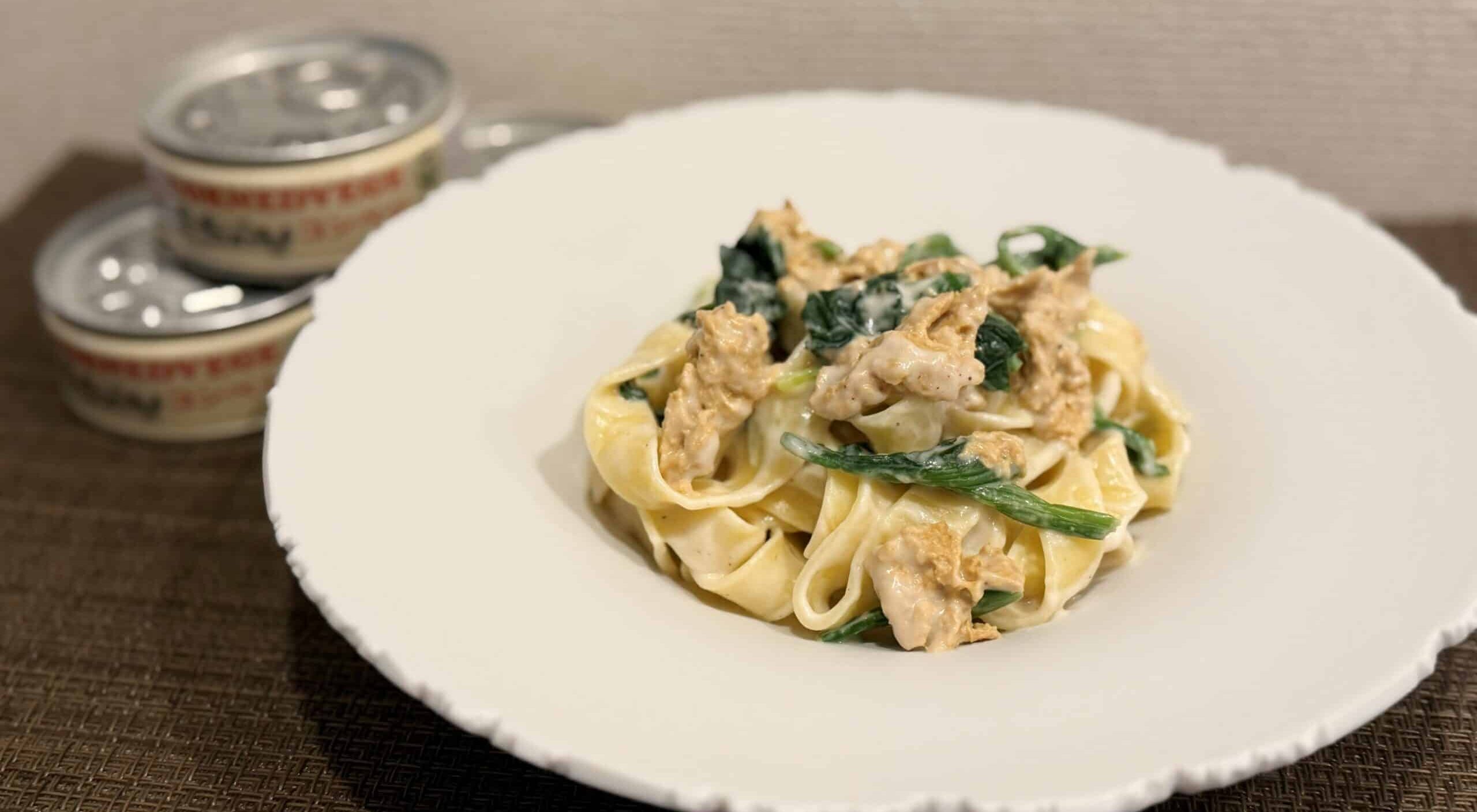 コンベジの旨味に、まろやかなクリームソースがしっかり絡む、食べ応えのある一品です。ほうれん草を加えることで彩りと風味がプラスされ、よりバランスのよい仕上がりに。同社の植物生まれのホワイトソースを使用することで、手間をかけずに本格的なパスタが出来上がります。