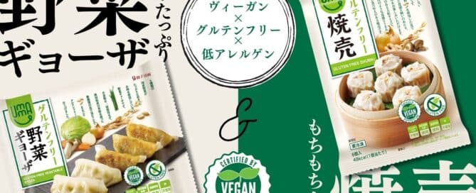 餃子計画の「UMAUMA」ブランドの餃子と焼売。ヴィーガン×グルテンフリー×低アレルゲンで、ベジプロジェクトのヴィーガン認証を取得。6種類の野菜をふんだんに使用した餃子と、ジューシーで歯応えのある植物性のお肉を使用した焼売で、ベジタリアンやヴィーガン、アレルギーもちの方に限らず「うまい!」と満足できるでしょう。