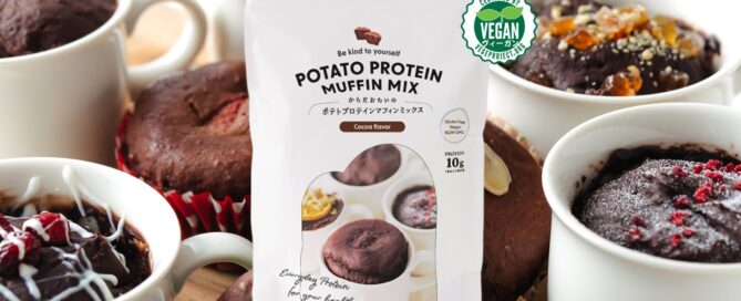 北海道産じゃがいも由来のポテトプロテインを使用したマフィンミックスが新発売。豆乳など植物性ミルクを使用することで、1食でたんぱく質10gが摂取できます。作り方は材料をまぜて電子レンジで2分温めるだけ。味もパティシエ監修の本格的なスイーツクオリティ。手軽にココアの風味としっとりしたヴィーガンマフィンの出来上がり!