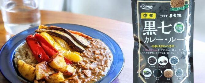 黒ニンニク、黒カリン、黒糖など、7つの黒色素材を使用し、釜を直火にかけ素材をじっくりと練り上げる「直火焼き」で作られた「コスモ直火焼 黒七 カレー・ルー 中辛」。小麦不使用、化学調味料不使用、さらに動物由来の原材料も不使用でベジプロジェクトのヴィーガン認証も取得しています。お店のような味をおうちで堪能できます。