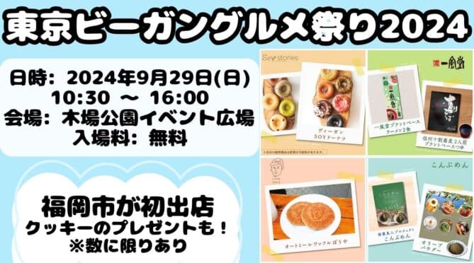 9/29(日)、江東区の木場公園にて「東京ビーガングルメ祭り」が開催されます。福岡市は、ベジプロジェクトが専門家として協力している「食のユニバーサル推進事業」の一環で本イベントに出店。一風堂やヴィーガンスイーツ等を紹介します。当日は同ブースにて、ヴィーガン&グルテンフリーのクッキーをプレゼント!昨年は藤井風も来場!