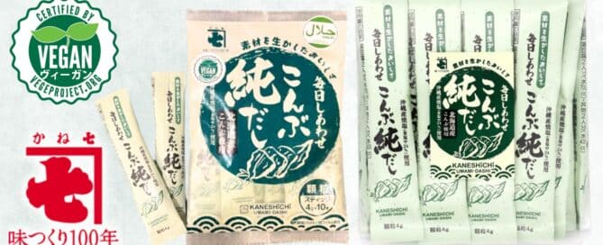かね七株式会社のスティックタイプの顆粒だし「毎日しあわせ こんぶ純だし」は、うまみ調味料不使用。お湯に溶かすだけで本格的なこんぶだしが出来上がります。こんぶの香りと旨味をしっかり感じられつつ雑味のない味わいで、和洋中問わず様々な料理で活躍します。ベジプロのヴィーガン認証を取得をしたことで新聞にも取り上げられました。