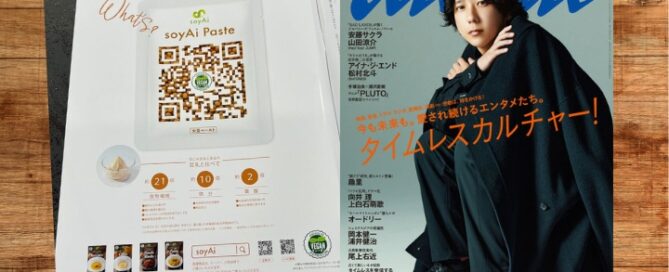 人気雑誌「anan」2023年10月4日号にヴィーガン商品が掲載中!パッケージ全面にプリントされたQRコードがインパクト大の「soyAi大豆ペースト」です。雑誌の裏表紙をめくってみてくださいね。そしてこの商品をはじめ、ヴィーガン認証マーク付の商品がたくさん店頭に並ぶイベントをご紹介。このチャンスをお見逃しなく!