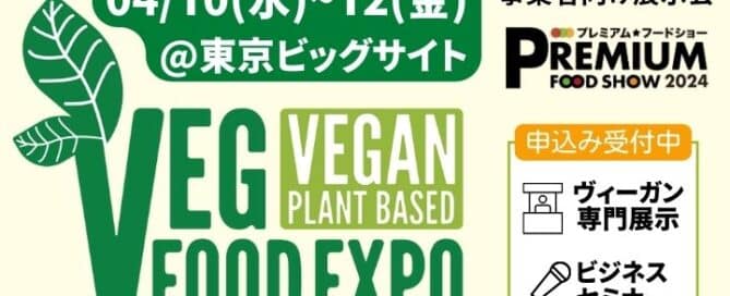 【要申込】2024/4/10~12に東京ビッグサイトで事業者向けの展示会「プレミアム・フードショー2024」が開催。展示事務局とNPO法人ベジプロジェクトジャパンの共同企画『ヴィーガンセレクション』ではヴィーガン・プラントベースの食品・食材が多数紹介されます。初日にはヴィーガン対応のビジネスセミナーも開催。